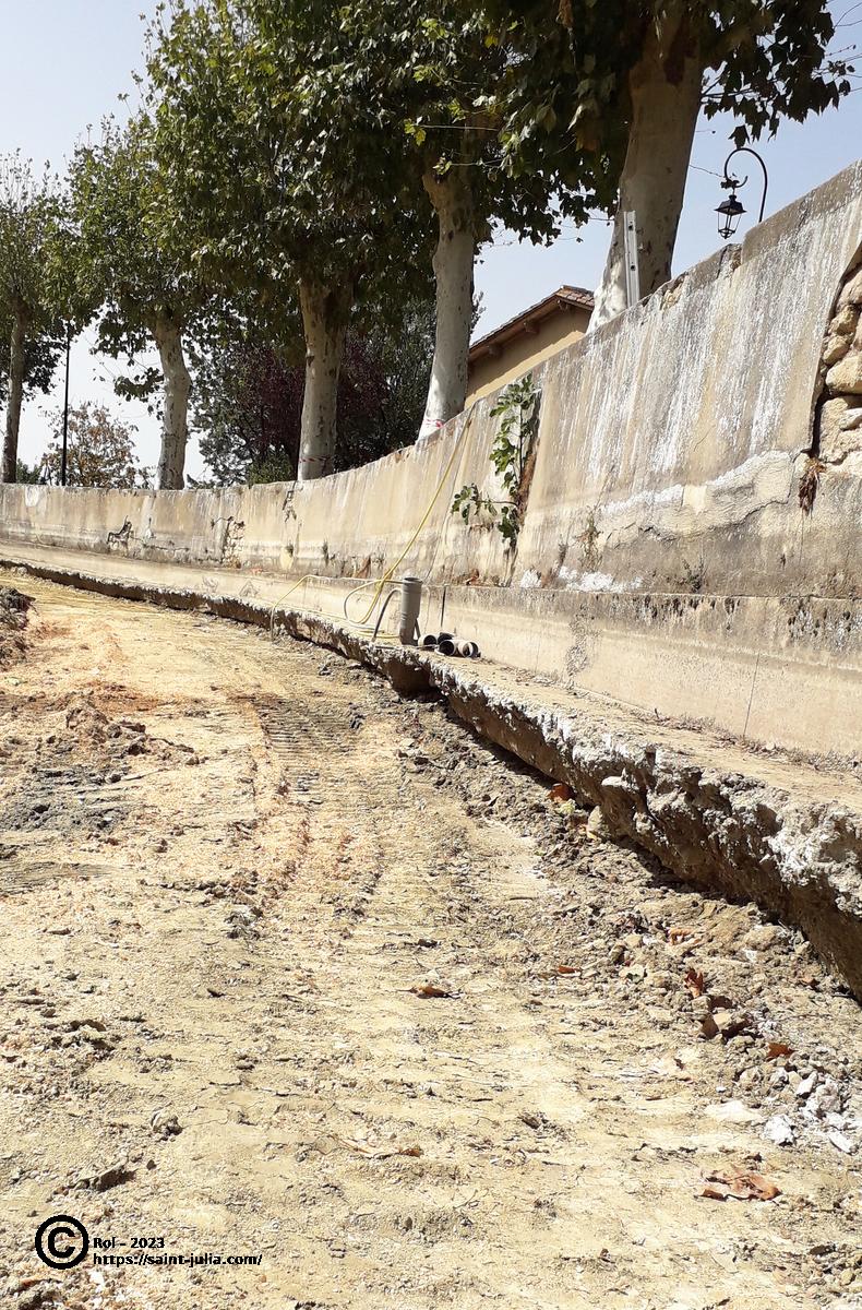 Les fondations du murs apparaissent sapées. On observe une fissure importante qui semble aller jusque sous la route et correspondre à son affaissement visible plus haut. Le mur lui même semble solide et intact.
