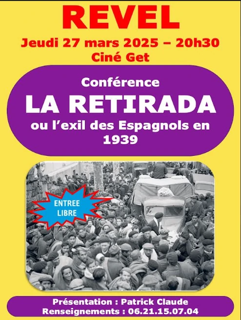 - La Retirada, l'exil des Espagnols en 1939 Une conférence organisée par la SHRSF, sur l’exil des espagnols en 1939, la RETIRADA, au ciné-Get le jeudi 27 mars à 20h30 par Monsieur Patrick Claude, qui s’intéresse à la Retirada depuis l’âge de 14 ans.