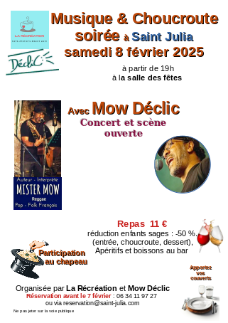 - Soirée Musique & Choucroute à Saint Julia, organisée par La Récréation et Mow Déclic, le 8 févier 2025 à 19h, dans la salle des fêtes.