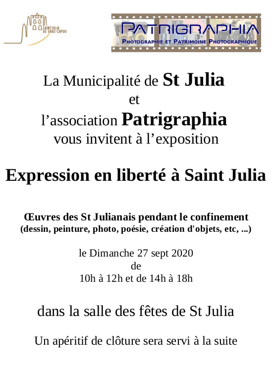 Les travaux des Saint Julianais pendant le confinement Exposition préparée par Patrigraphia et le CCAS pour montrer quelques oeuvres réalisées par les Saint julianais pendant le confinement.