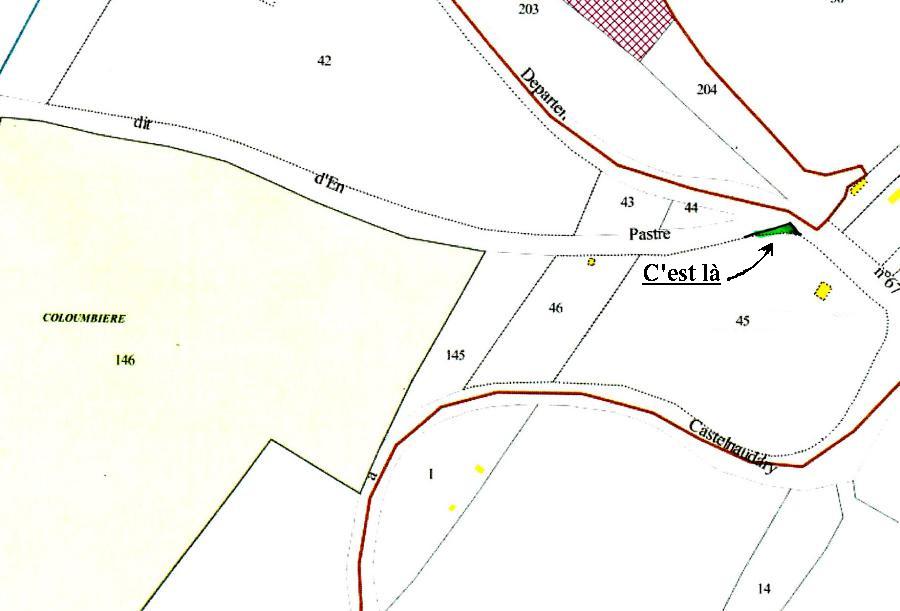 • Il s'agit du coin en vert tout en haut de la parcelle 45 sur le plan (cliquer dessus pour agrandir). Le portail d'entrée et le compteur électrique sont actuellement placées sur ce coin en vert.