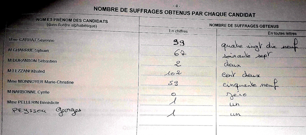 - Cyrille Narbonne : 65 voix (38,9 %)