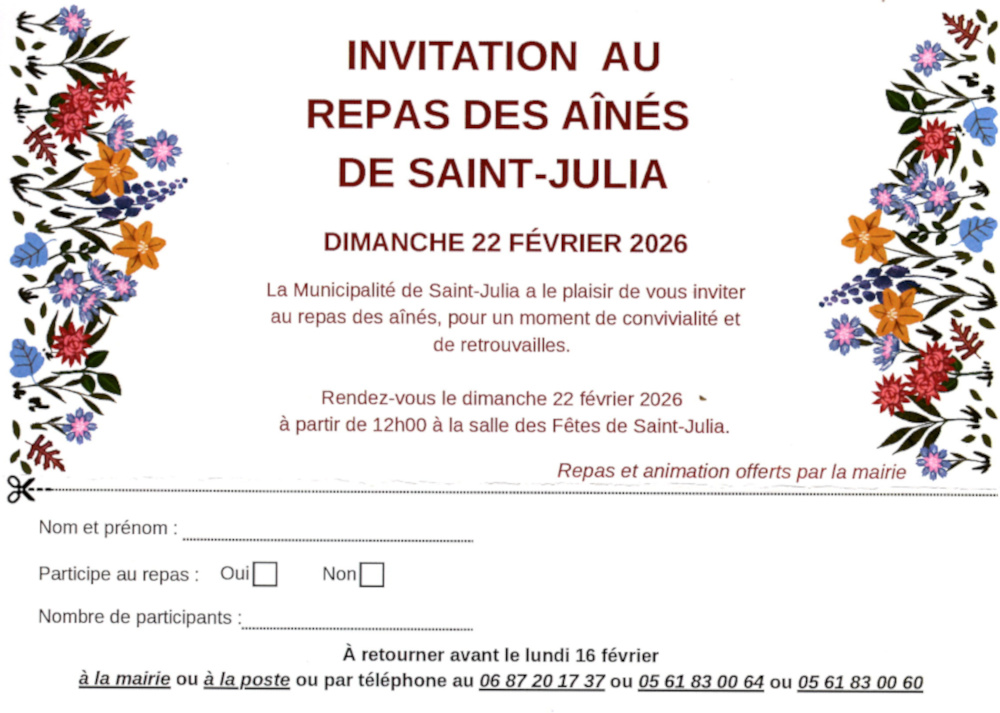 - Repas des ainés dimanche 22 février, à Saint julia, Rendez vous à la salle des fêtes, à 12 h. Télécharger le flyer