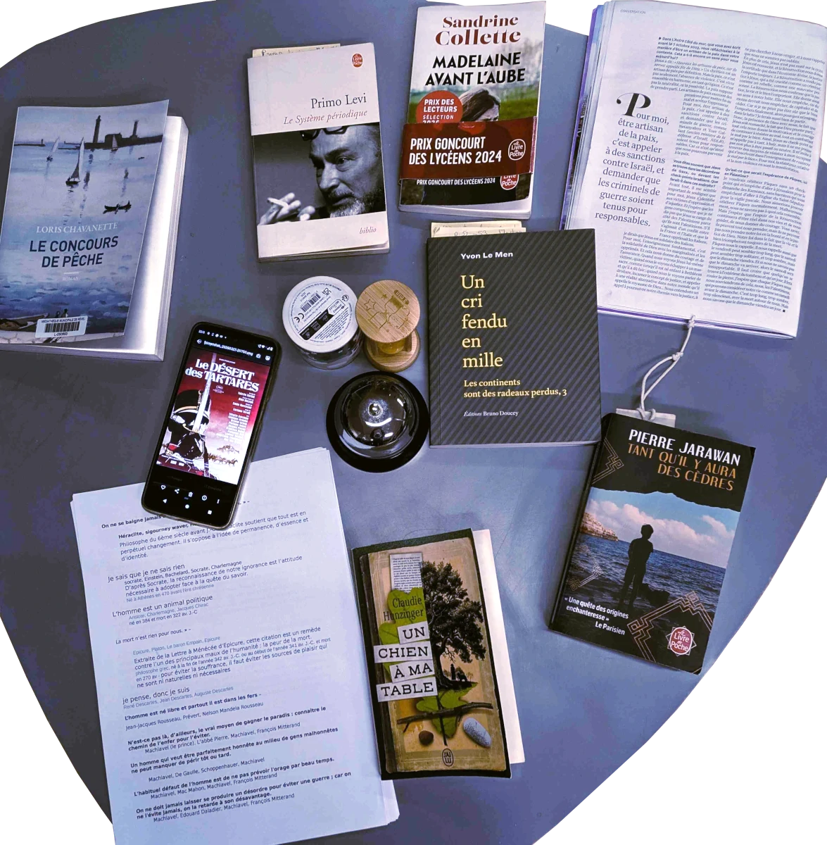 Lors de la dernière séance, nous avons traversé des ambiances très diverses; drôle avec les protagonistes du Concours de pêche, de Loris Chavanette, palpitante avec l’arrivée au Liban de l’enfant Samir sur les traces de son père disparu lue dans Tant qu’il y aura des cèdres de Pierre Jarawan, intrigante avec Un chien à ma table de Claudie Hunzinger, cruellement ironique avec Le système périodique de Primo Levi.