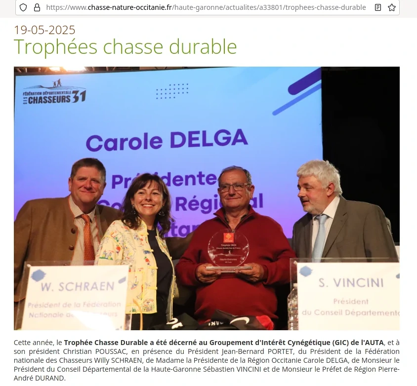 - le Trophée Chasse Durable a été décerné à Christian POUSSAC, pour le Groupement d'Intérêt Cynégétique (GIC) de l'AUTA dont il est le président. Voir l'article sur chasse-nature-occitanie.fr