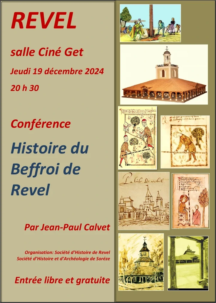 - conférence sur le Beffroi de Revel de la Société d'Histoire Revel Saint Ferréol (SHRSF) à 20h30 au Ciné-Get sur le Beffroi de Revel. An de grâce 1342, le 8 juin, dans la forêt de Vaure, le pal vient d’être planté, la Bastide de Revel est fondée, quelle belle cérémonie ! [… lire la présentation de cette conférence] Le beffroi est le haut-lieu symbolique de tous les pouvoirs ; ceux du roi, les pouvoirs administratifs, économiques, policiers et judiciaires (le pouvoir spirituel étant en marge périphérique près de l’église).