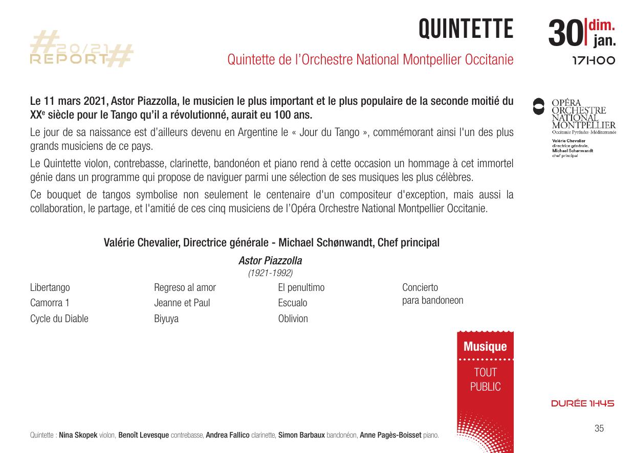 - Théatre des 3 ponts Castelnaudary : Quintette de l’Orchestre National Montpellier Occitanie : Le 11 mars 2021, Astor Piazzolla, le musicien le plus important et le plus populaire de la seconde moitié du XXe siècle pour le Tango qu’il a révolutionné, aurait eu 100 ans. Le jour de sa naissance est d’ailleurs devenu en Argentine le « Jour du Tango », commémorant ainsi l'un des plus grands musiciens de ce pays. Le Quintette violon, contrebasse, clarinette, bandonéon et piano rend à cette occasion un hommage à cet immortel génie dans un programme qui propose de naviguer parmi une sélection de ses musiques les plus célèbres.