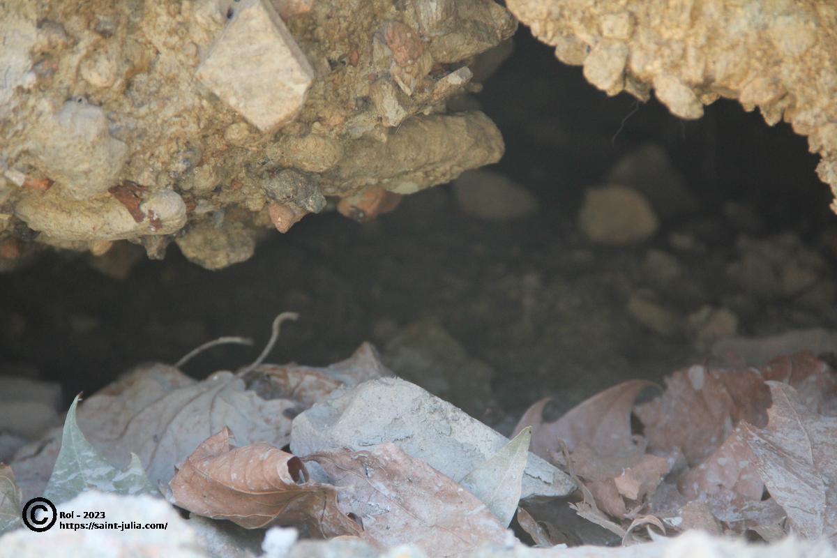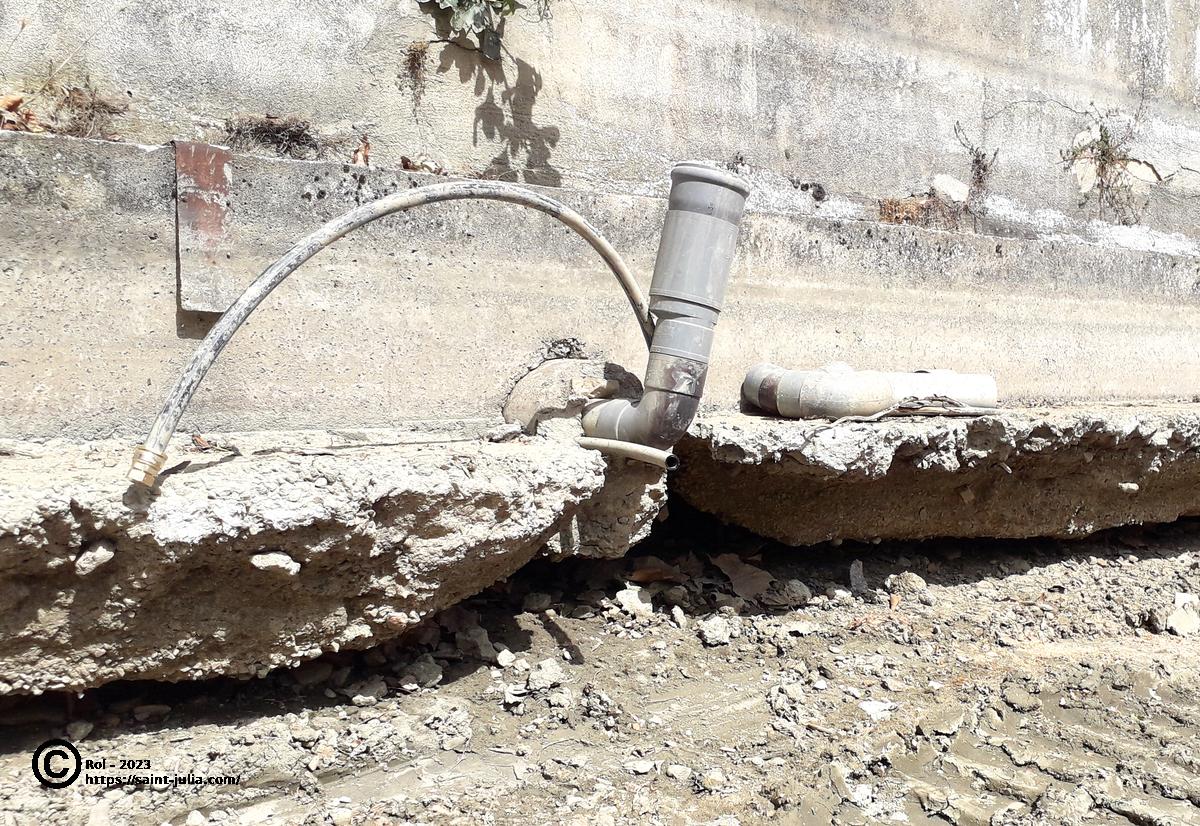 - Les fondations du murs apparaissent sapées. On observe une fissure importante qui semble aller jusque sous la route et correspondre à son affaissement visible plus haut. Le mur lui même semble solide et intact.