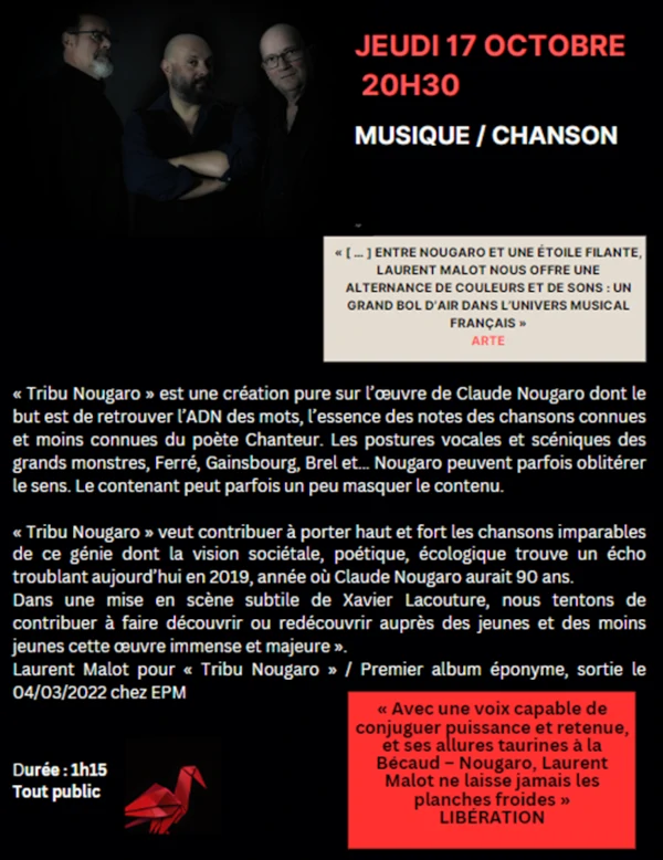 - Tribu Nougaro au Théatre des 3 ponts de Castelnaudary à 20h30 est une création pure sur l’œuvre de Claude Nougaro dont le but est de retrouver l’essence des notes des chansons connues et moins connues du poète chanteur. « Tribu Nougaro » veut contribuer à porter haut et fort les chansons de ce génie dont la vision sociétale, poétique, écologique trouve un écho troublant aujourd’hui. Renseignements 04 68 94 60 85