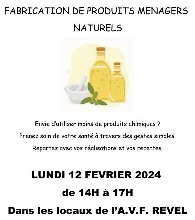 - lundi 12 février 2024 - fabriquez vos produits ménagers à Revel de 14h à 17h, un nouvel Atelier VIA SANTÉ est organisé par les AVF (Acceuil des villes de France), Batiment Les Bains Douches, 13 Boulevard Gambetta 31250 Revel. Insciption aux AVF : Béatrice CARIVENC, avf.revel.sec@uravfmp.fr - Voir sur le site des AVF