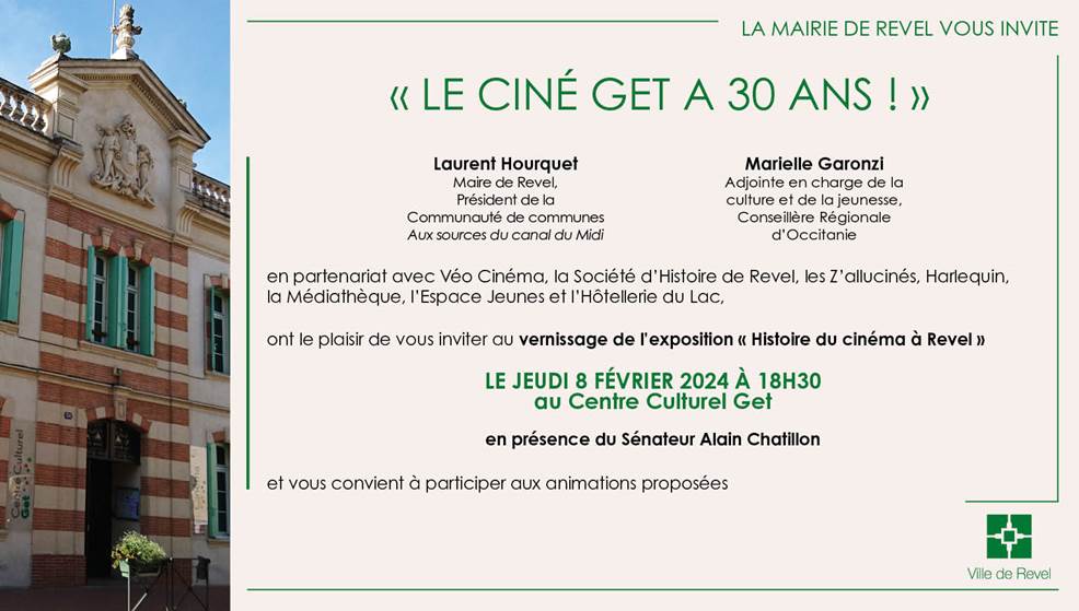 - Jusqu'au 17 février 2024 - expo “les 30 ans du Ciné Get” à Revel l'Exposition (avec une rétrospective du cinéma à Revel depuis 1907), sera visible jusqu'au 17/02 de 09:00 à 12:00 et de 15:00 à 18:00 en semaine et le samedi en continu de 10:00 à 18:00.