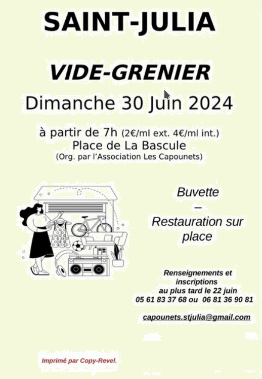- Foire aux chapons à Saint Julia le dimanche 22 décembre 2024. Exposants, loto, millas, buvette, repas et chapons. précisions à suivre.