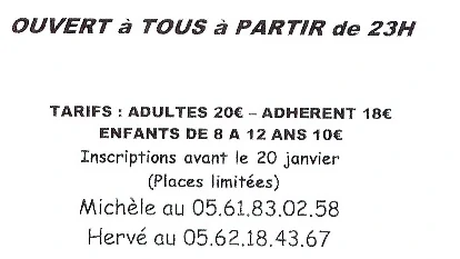 - Assemblée Générale des Capounets le samedi 1er février à 18h dans la Salle des Fêtes. (Rapport moral(festivités organisées en 2024), Bilan financier et prévisionnel, Questions diverses : 10h de la Belote, Soirée 80 ou autre, vide-grenier, fête locale etc. L'AG sera suivie d'un apéritif.
