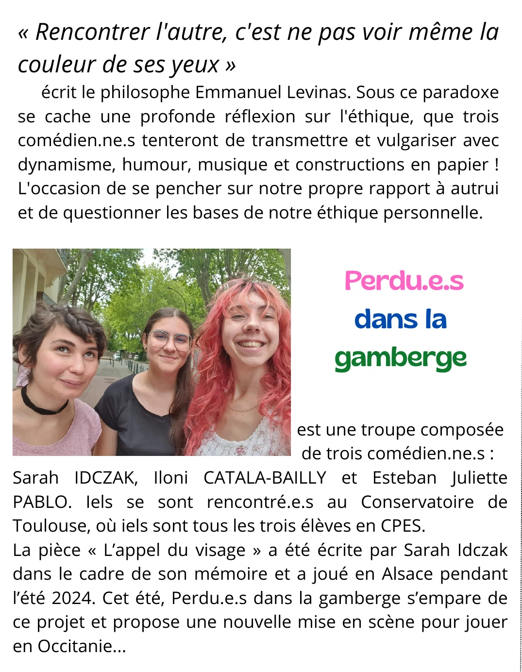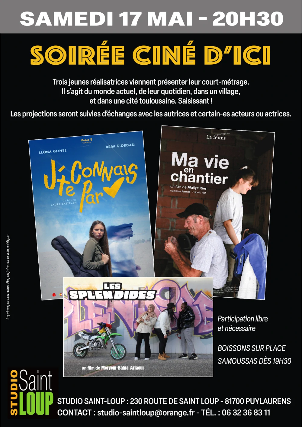 - Cirque au studio Saint loup à 17h17 le vendredi(←corrigé) 7 mars 2025. Acrobatie sur trapèze (~20 mn) avec Benjamin De Matteïs et Anna Le Bozec qui va manger debout sur un trapèze, puis après on verra bien… Puis Le cirque des petites natures: PÏu - Camille (Comédienne) et Hugo (Musicien) raconteront l'histoire d’une amitié entre une poule et un ours (~20 mn). Un récit rempli de solidarité et d’humour, un spectacle pour être qui on est, assumer nos folies et nos rêves! Puis un bon goûter partagé pour les enfants, et la buvette sera ouverte pour les adultes (espèces)! Participation libre - Le flyer