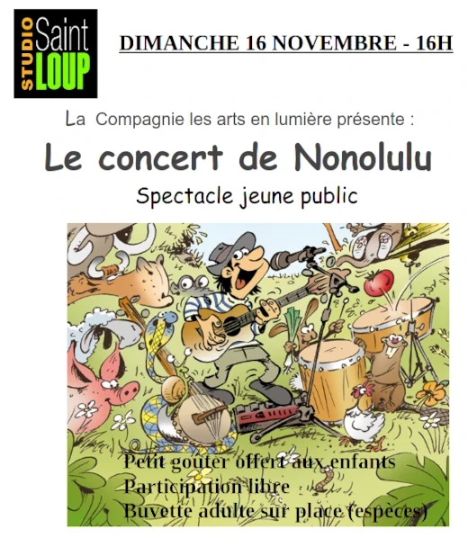 - Concert à Nonolulu, pour les jeunes (à partir de 3 ans) Oui, mais un concert particulier, pour enfants de 3 à 10 ans et pour tout le monde aussi. La Cie de Arts en lumière est de passage avec son “Concert de Nonolulu” interprété par Arnaud Solignac et ses instruments, cordes et percussions! Ca se passera au Studio Saint-Loup Dimanche 16 novembre 2025 à 16H, suivi d'un petit goûter offert aux enfants. Participation libre et buvette adultes (espèces). Ecouter quelques extraits Télécharger le flyer - On vous attend au sudio Saint loup, veuillez réserver au 06 32 36 83 11 ou par mail (studio-saintloup@orange.fr).