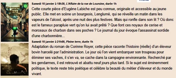 - Adaptation de Pleine Terre à Saint Félix de Lauragais le samedi 10 janvier 2026 à partir de 18h30 Adaptation du roman de Corinne Royer, cette pièce raconte l'histoire (réelle) d'un éleveur bovin harcelé par l'administration. Le jour où l'on vient embarquer son troupeau pour éliminer ses vaches, il s'en va, se cache dans la campagne environnante. Recherché par les gendarmes, il est retrouvé abattu neuf jours plus tard. Si le sujet est éminemment politique, le texte reste très poétique et célèbre la beauté du métier d'éleveur et du mode vivant.