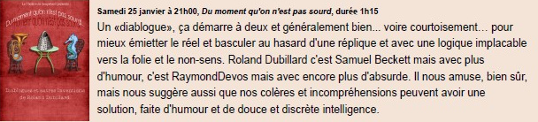 - Théâtre : Du moment qu'on est pas sourd (durée 1h30) - 21h à Saint Félix de Lauragais Un “diablogue”, ça démarre à deux et généralement bien… voire courtoisement… pour mieux émietter le réel et basculer au hasard d'une république et avec une logique implacable vers la folie et le non-sens. Roland Dubillard c'est Samuel Beckett mais avec plus d'humour, c'est Raymond Devos mais avec encore plus d'absurde. Il nous amuse, bien sûr, mais nous suggère aussi que nos colères et incompréhensions peuvent avoir une solution, faite d'humour et de douce et discrète intelligence.