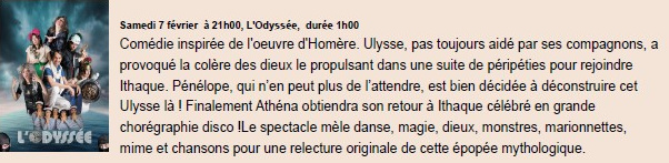 - Théâtre : L'Odyssée (durée 1h) - 21h à Saint Félix de Lauragais Comédie inspirée de l'œuvre d'Homère. Ulysse, pas toujours aidé par ses compagnons, a provoqué la colère des dieux le propulsant dans une suite de péripéties pour rejoindre Ithaque. Pénélope, qui n'en peut plus de l'attendre, est bien décidée à déconstruire cet Ulysse là ! Finalement Athéna obtiendra son retour à Ithaque célébré en grande chorégraphie disco ! Le spectacle mêle dans, magie, dieux, monstres, marionnettes, mime et chansons pour une relecture originale de cette épopée mythologique.