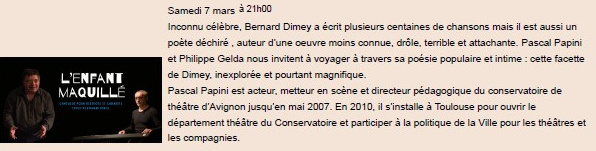 - Spectacle : L'enfant maquillé - 21h à Saint Félix de Lauragais Pascal Papini avec Philippe Gelda, au piano, nous invitent dans la poésie profonde et déchirante du plus célèbre inconnu de la chanson française, Bernard Dimey, auteur de nombreux succès comme « Syracuse », « Frédo »,« Mon truc en plumes », « Mémère ». Ils y parcourent en toute simplicité, les poèmes rares et méconnus du poète, chansonnier et dialoguiste, qui l'a accompagné toute sa vie.