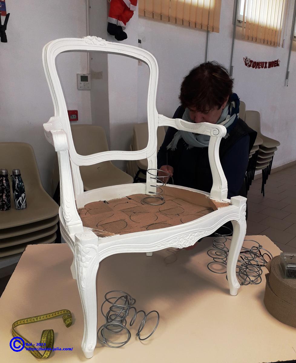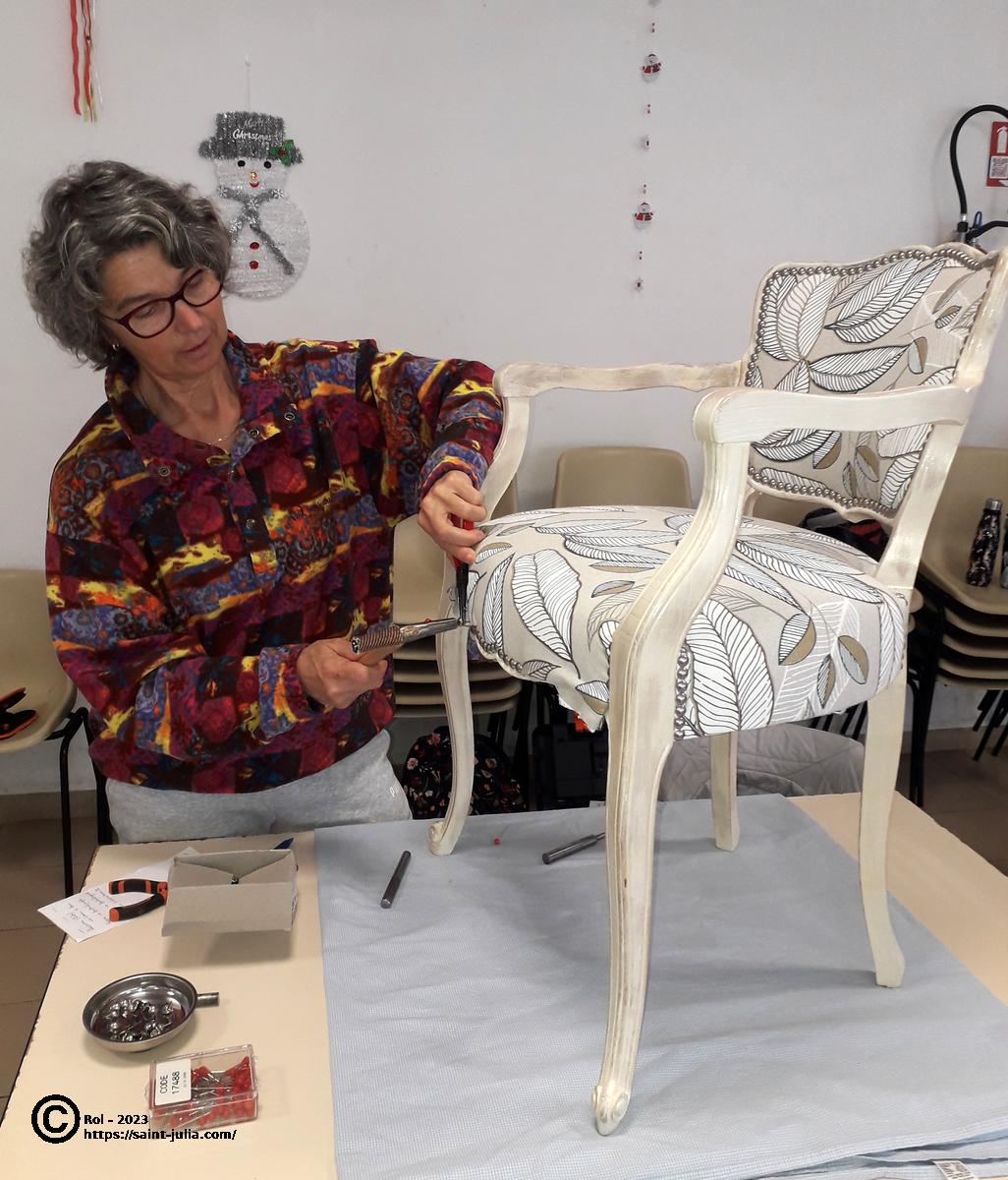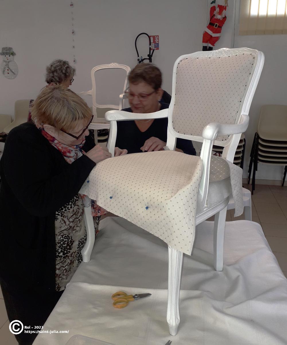 Visite de l'atelier le 9 janvier 2023, pour une petite cotisation annuelle, les participant.e.s sont accompagné.e.s par une professionnelle de la tapisserie d'ameublement, pour trouver des outils, choisir un ouvrage et pour effectuer sa restauration avec des conseils pratiques et éclairés. Les participants viennent presque tous des communes environnantes.