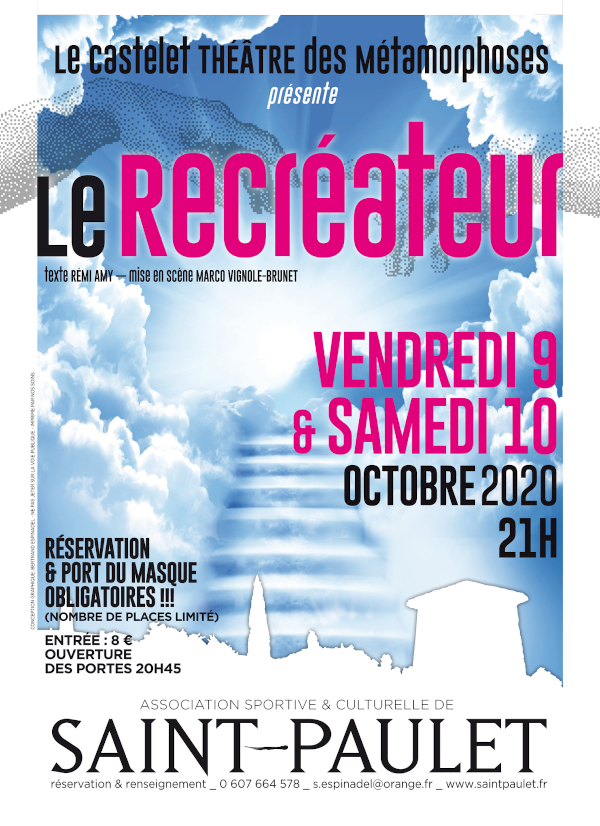 ’Association Sportive et Culturelle et la troupe du Castelet Théâtre des Métamorphoses sont prêtes à vous accueillir pour deux représentations de la pièce, “Le Recréateur”, vendredi 9 et samedi 10 oct. à 21 H. “Le Créateur constate que les hommes sont devenus sa plus grande déception ! Dieu décide d'en finir et de créer une nouvelle créature parfaite ! Avec humour et légèreté, l'auteur interroge la responsabilité de chacun dans les dérives de notre société moderne.” Texte de Rémi Amy. Mise en scène : Marco Vignole-Brunet. Avec :AM.Borg, V.Catala, Ph.Dalloux, C.Ghinamo, Ph. Janot, S. Jugier, A. Lecorre, F. Pitoun, M. Ribeirinha. En raison des contraintes sanitaires, le nombre de spectateurs est strictement limité sur chaque soirée. Il est donc obligatoire de réserver votre place par mail s.espinadel@orange.fr (ou téléphone 06 07 66 45 78), en précisant votre nom, le jour choisi, le nombre de places et votre numéro de téléphone (au cas où le spectacle serait complet). Entrée : 8 euros (ouverture des portes à 20H45). Nous comptons sur vous pour arriver en forme, respecter le lavage des mains, la distanciation et le port du masque (à partir de 11 ans) dès l'approche du lieu du spectacle, pendant et après celui-ci. L'entrée se fera comme d'habitude par la porte arrière de la salle où vous pourrez vous installer de façon à laisser un siège libre avec votre voisin.e d’un groupe différent. Pour respecter le contexte sanitaire, nous n’organiserons pas de buvette. Merci pour votre compréhension, votre confiance, votre patience et le sourire dans les yeux. Nous avons hâte de vous retrouver ! Vive la culture ! L’équipe ASC de Saint-Paulet
