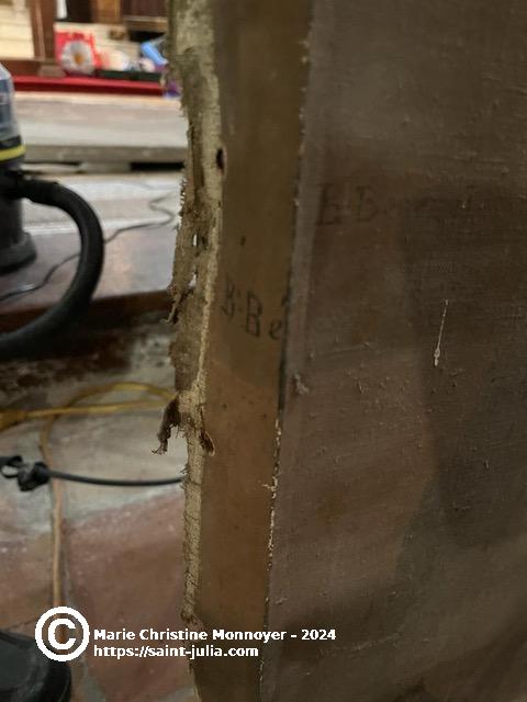 Examinons maintenant le tableau de Bénézet : Monseigneur de Belsunce, évêque de Marseille, implore le ciel de lui venir en aide, autour de lui, des religieux, des malades, leurs proches et les aidants. - Il faut savoir qu’en 1720, la peste arriva dans la ville par navire marchand et fut responsable de plus de 100 000 morts en deux ans ! -Le fléau étant considéré à l’époque comme une punition divine, le prélat prit l’initiative de placer son diocèse sous la protection du Sacré Cœur de Jésus, afin de soutenir le clergé ainsi que la foi. -Dévotion et dévouement : ce chef d’Eglise se montra extrêmement courageux, s’exposant lui-même à la contamination au plus près des malades dans les demeures parfois murées, les rues, les processions …( 1/5 ème du clergé périt ) . Restons nous-mêmes au plus près du tableau : Un restaurateur nous fait remarquer l’étonnante double signature du peintre : -Une, visible sur un coin gauche : B.Bénezet 1887 -Une autre, sur la tranche : B.Bé … Il nous explique que la toile devait être initialement plus grande et donc aurait été rétrécie. En effet, l’arrière du tableau nous montre un châssis réduit. Ceci pourrait éventuellement répondre à notre observation, à savoir que la représentation du personnage principal ( Mgr de Belsunce ) se retrouve légèrement déportée à gauche sur la toile .