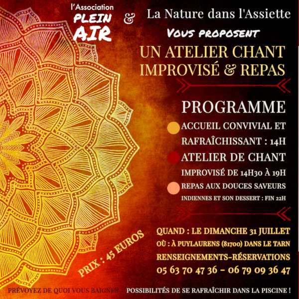 - dimanche 31 Juillet à Puylaurens - Atelier chant improvisé + repas, Plein Air s'associe à “La Nature dans l'Assiette” pour vous proposer une demi-journée de régalade : Atelier Chant Impro l'après-midi, suivi d'un repas aux douces saveurs indiennes (et son dessert…). Le prix de l'ensemble est de 45 euros.Le programme est le suivant : accueil 14h; Atelier de chant Improvisé jusqu'à 19h (s'il fait beaux, prévoyez de quoi vous baigner : possibilité de se rafraîchir dans la piscine..!) ; 19h30 : repas 🧆🥘🍲🥙🥗🍨…fin 22h.