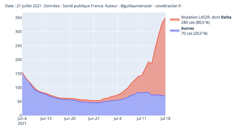 - On voit que jusque début juillet, le variant delta n'influençait pas beaucoup les chiffres, même si sa progression fulgurante pouvait se deviner. Aujourd'hui il fait doubler le nombre total des contaminations, mais à l'intérieur de la courbe globale celle du variant Delta fait plus que tripler chaque semaine. La Haute Garonne dépasse la moyenne nationale (un peu moins de vaccinations en moyenne). A ce rythme, les 9000 nouveaux cas en moyenne par jour, correspondent à une moyenne de 9000 x 3^4 = 720.000 nouveaux cas/jours dans un mois.