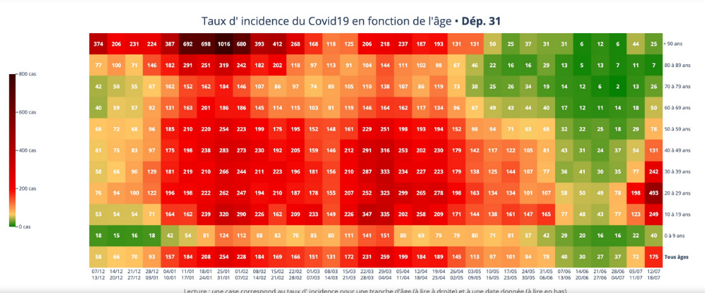 - Ce tableau indique les nombres de cas de Covid par jour en Haute Garonne par tranche d'age et par période. Les vieux sont en haut, les jeunes en bas, les chiffres commences à gauche en fin 2020 et se terminent à droite en juillet 2021. Les chiffres les plus élevés sont en rouge puis en noir.