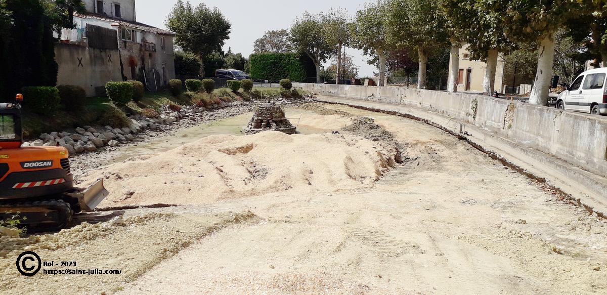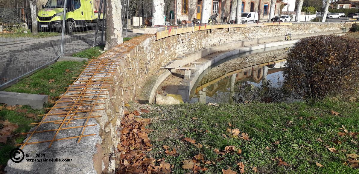 Avant que la mare ne se remplisse ȧ nouveau, des travaux ont été entrepris pour consolider le mur cotė rue, les racines des platanes mettant son devenir en péril. Une petite chape de béton a etė coulée pour renforcer sa base. De plus pour ėconnmer l'eau de la Montagne Noire, une mini pompe alimentera le jet d'eau (Fonctionnement en circuit fermé).