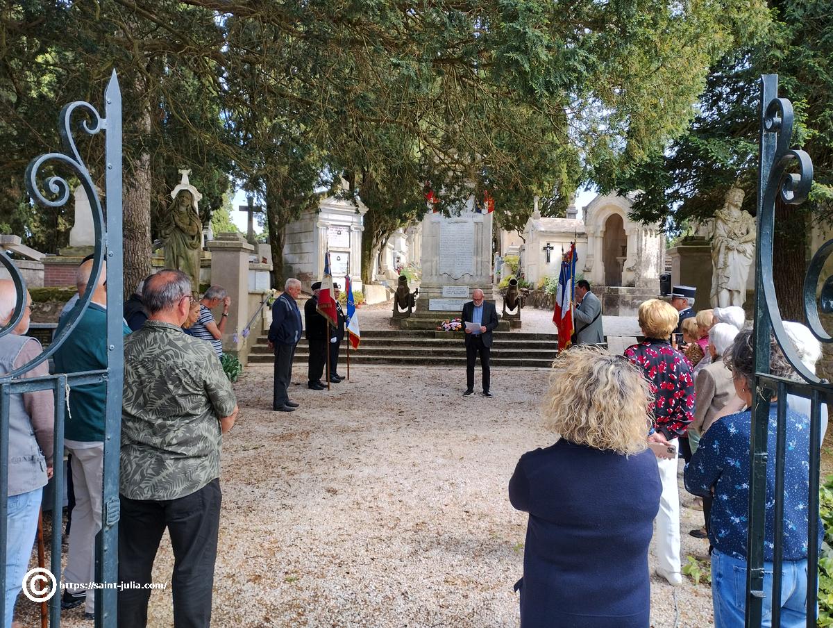 - Cérémonie du 8 mai 2025 à Saint Julia : (16h30 en 2025). Le 8 mai 1945, Charles de Gaulle s’adresse aux Français à la radio pour annoncer la capitulation de l’Allemagne nazie. Un discours marquant la fin de la Seconde Guerre mondiale en Europe et le début d’un nouvel espoir pour la France libérée. Voir le discours